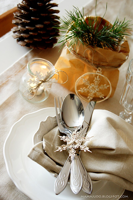 "So here is my table decoration. I have made multifunctional toppers with a secret. You can use them different ways: put together with knife and folk, or put them into a jar and stir fruit in mulled wine... Children can use them as magic sticks. Or you can put names on them and stick into tangerins or apples to indicate right seats at the festive table. And finally there is a secret hidden in decorated central part: kraft rolls with Christmas wishes of predicions so every guest at the table could have a glance into the future. The rolles dont's fall down due to small double sided stickers which are quite easily separated from the decor."